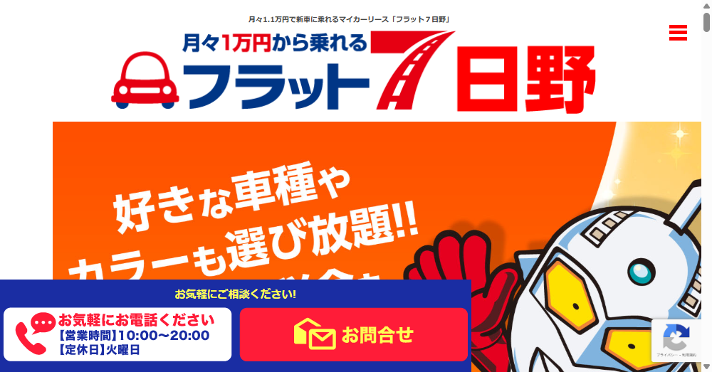 フラット7日野は東京都日野市に位置するカーリース専門店で、月々1.1万円から新車に乗れるマイカーリースを提供しています。