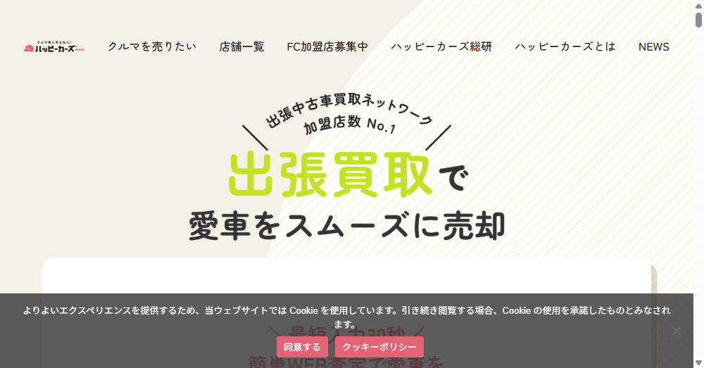 - 全国120店舗を展開するハッピーカーズは、出張中古車買取のネットワーク数No.1を誇り、迅速な査定を実現。お客様の愛車の査定時間はわずか15分です。