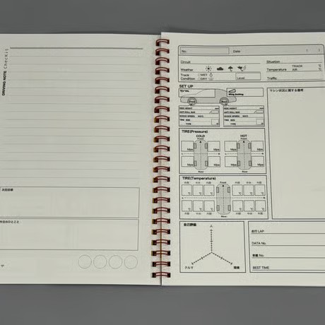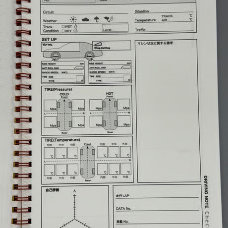 セッティング情報や自分のドライビングを書き留めることのできるノートです♪