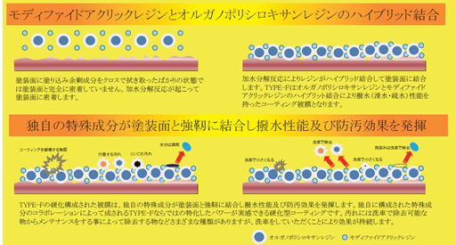 独自の特殊成分が塗装面と強靭に結合し撥水性能および防汚効果を発揮します。
